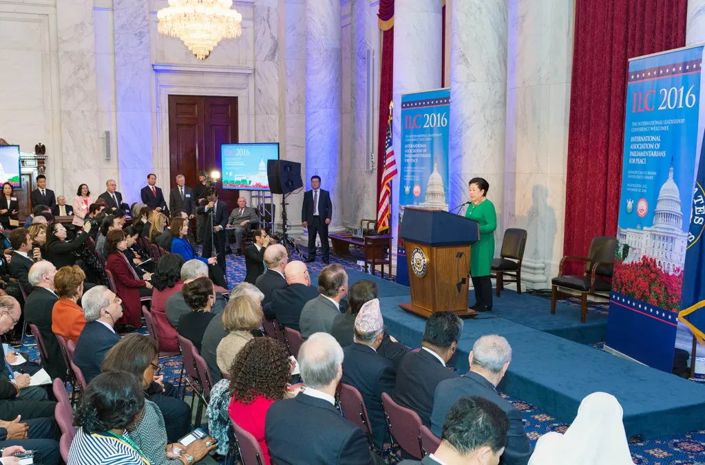 11 月30 日午後、米国の首都ワシントンの上院議員会館に真の父母様をお迎えして、北米大陸の「世界平和国会議員連合(IAPP)」創設大会が開催され、多数の上下両院議員をはじめ、世界56 ヵ国から駆け付けた現役国会議員70 人など、各界の指導者約500 人が参加しました。11 月28 日から12 月1日にかけてワシントン市内で開催された「国際指導者会議(ILC)2016」(主催・UPF、ワシントン・タイムズ財団)の一環として行われたもので、参加者からはIAPP の創設とその趣旨に賛同する声が相次ぎました。