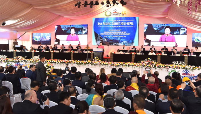 「現代の重要課題に取り組むー共生共栄共義」をテーマに開かれた同サミットには、ネパールのマーダブ・クマール・ネパール元首相とK.P.シャルマ・オリ首相、ミャンマーのアウン・サン・スー・チー国家最高顧問、カンボジアのフン・セン首相をはじめとして、アジア太平洋圏の45か国から国家的指導者500人を含む1500人が参加した。