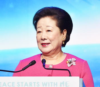 5000人の超宗教合唱団が「Total Praise」を讃美したあと、真のお母様が文善進・世界会長を伴われてご登壇。み言(別記)を語られました。