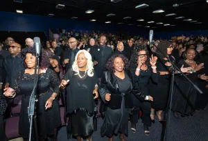 希望前進大会(米カリフォルニア州)でエミー賞を受賞したカーティス・ファロー氏の指揮による約500人の超宗教・超教派聖歌隊の合唱