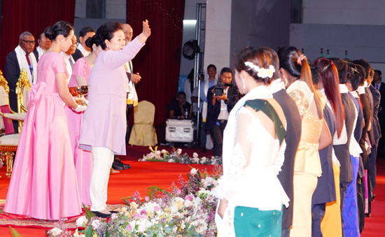 ビン・チン副首相とパラオ共和国のデビー・レメンゲサウ大統領夫人の祝辞に続いて、リトル・エンジェルス芸術団の少女たちが、祝歌としてカンボジアの歌を歌いました。最後に、韓国の發旺山で点火された聖火が伝授され、齋藤統(はじめ)UPFメコン地域局長の先導で億万歳を三唱して、祝福式は終了しました。