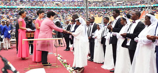 アフリカ諸国の現職首脳および公式代行者5人、国会議長12人、アフリカ連合(AU)代表、西アフリカ諸国経済共同体(ECOWAS)代表、南アフリカの国会議員約40人、宗教団体長127人、国王および族長219人など約2000人が臨席する中、約20万人が天から祝福の恩恵にあずかりました。