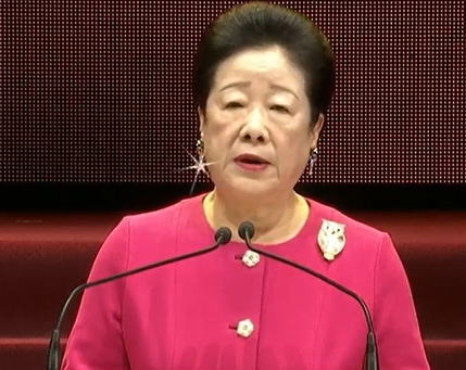 インターネットを通した参加者の映像を前にみ言を語られる韓鶴子総裁