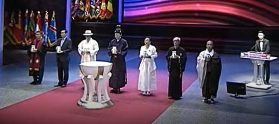 午前10時、開会が宣言されると、初めに7大宗教の代表者による「ピース・オファリング(平和祝願式)」のセレモニーが行われました。神統一世界への願いを込め、代表者たちが手にした水を合わせる合水式を行うと、李基誠・神韓国家庭連合会長が告天文を朗読しました。