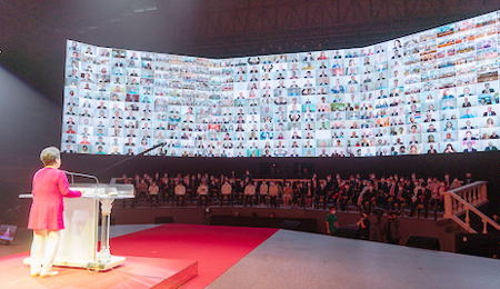会場では、舞台の前に真のご家庭をはじめとする代表参加者たちが座り、その後ろにインターネット双方向中継で参加する世界の代表者たちの映像が映し出される中で、大会が進行されました。